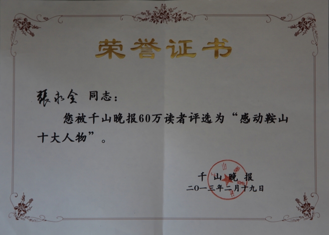 在《千山晚报》创刊20周年之际,很荣幸获得《千山晚报》评选的“感动鞍山十大人物”。