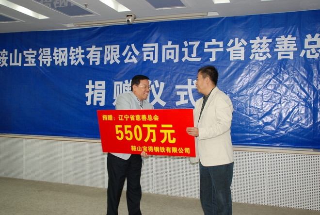 9月23日,公司助学助老捐赠仪式在省慈善总会隆重举行。公司总经理张铁汉向省慈善总会捐赠人民币550万元,这笔善款将用于鞍山市的助老、捐资助学等项目。