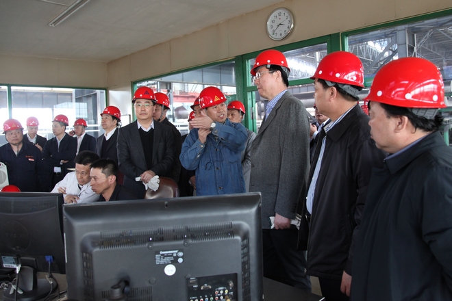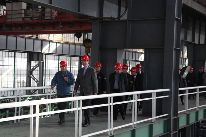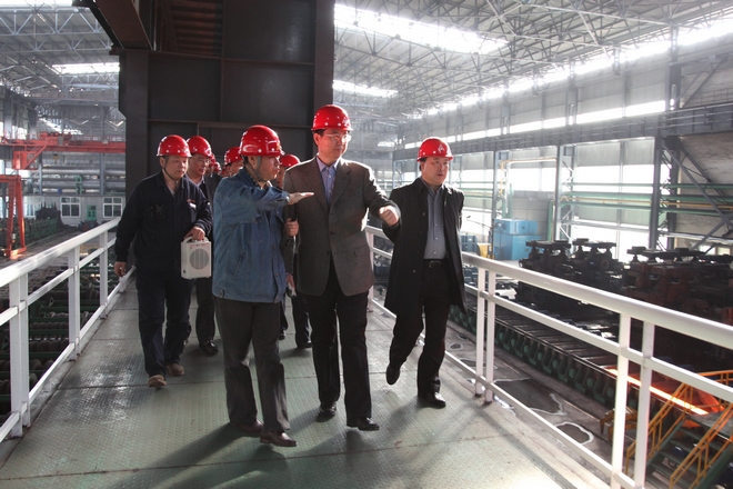 4月9日,市长王世伟到公司调研,公司总经理张铁汉陪同到120万吨H型钢生产线参观,并向王市长介绍公司生产情况。