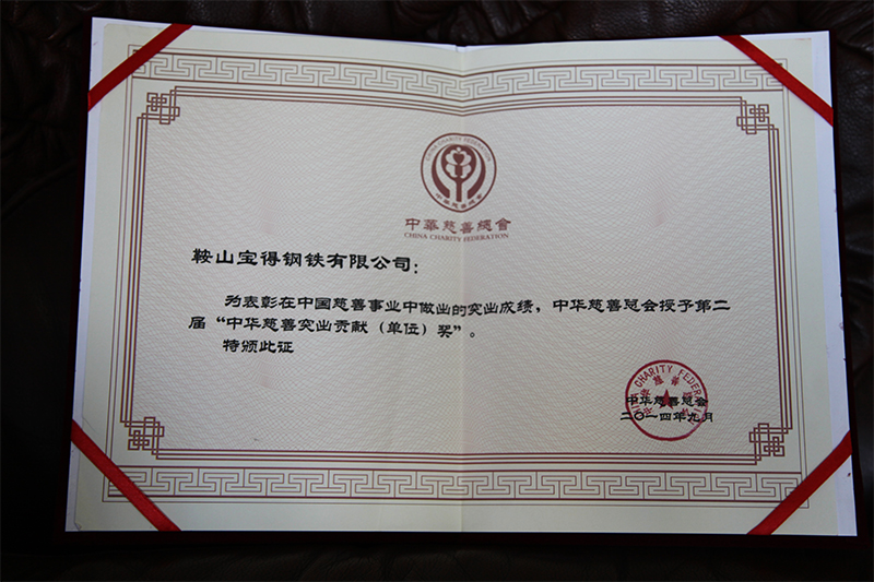 为表彰在中国慈善事业中作出的突出贡献,中华慈善总会授予公司第二届“中华慈善突出贡献(单位)奖”。5月20日,副市长陈守义、市民政局局长解永浮、副局长龚毅涛及市慈善总会领导到公司颁奖,董事长、总经理接受颁奖。