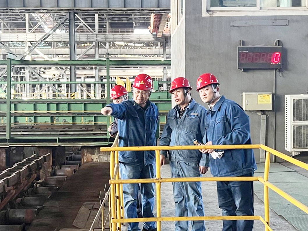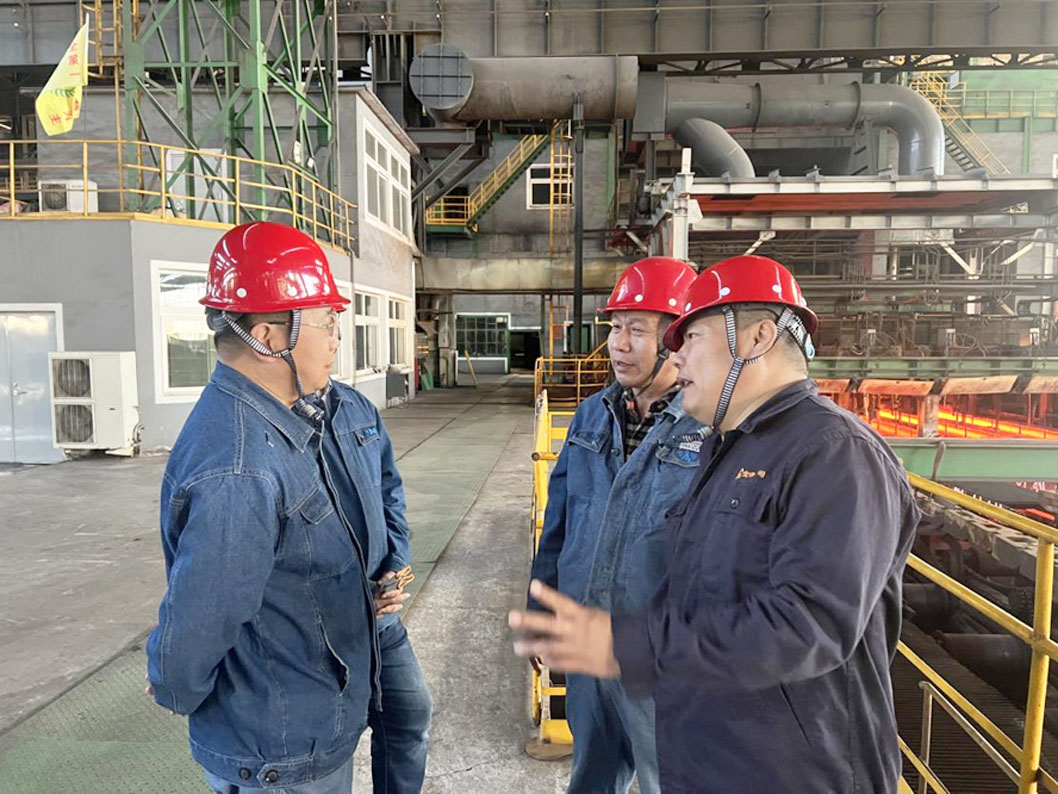 督导组组长杨殿新在炼钢厂连铸生产现场与公司生产经理兼安全总监陈旭东及炼钢厂厂长闫海龙进行交流